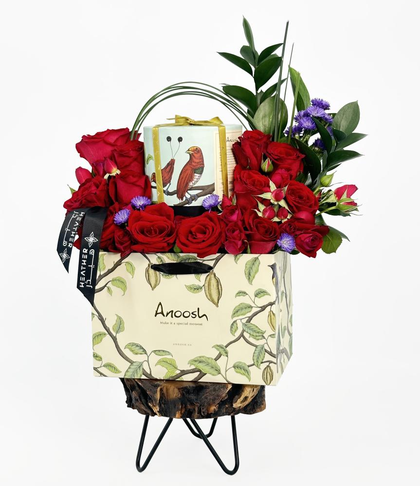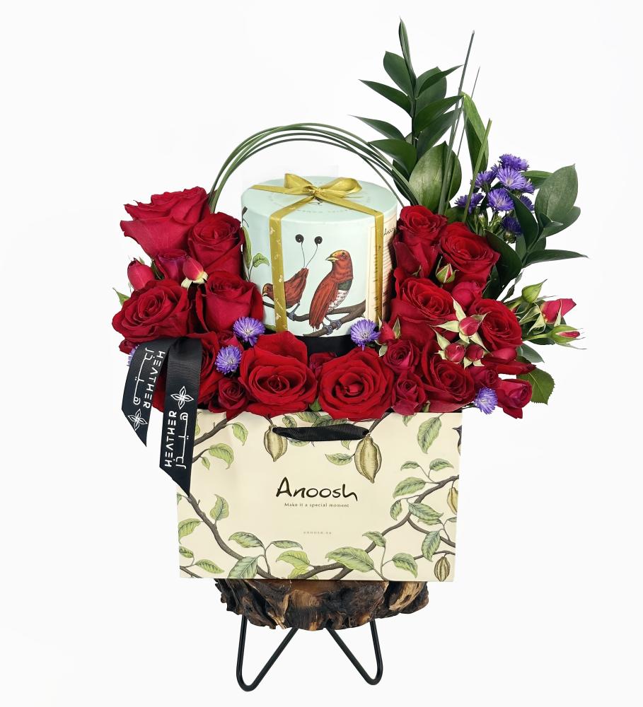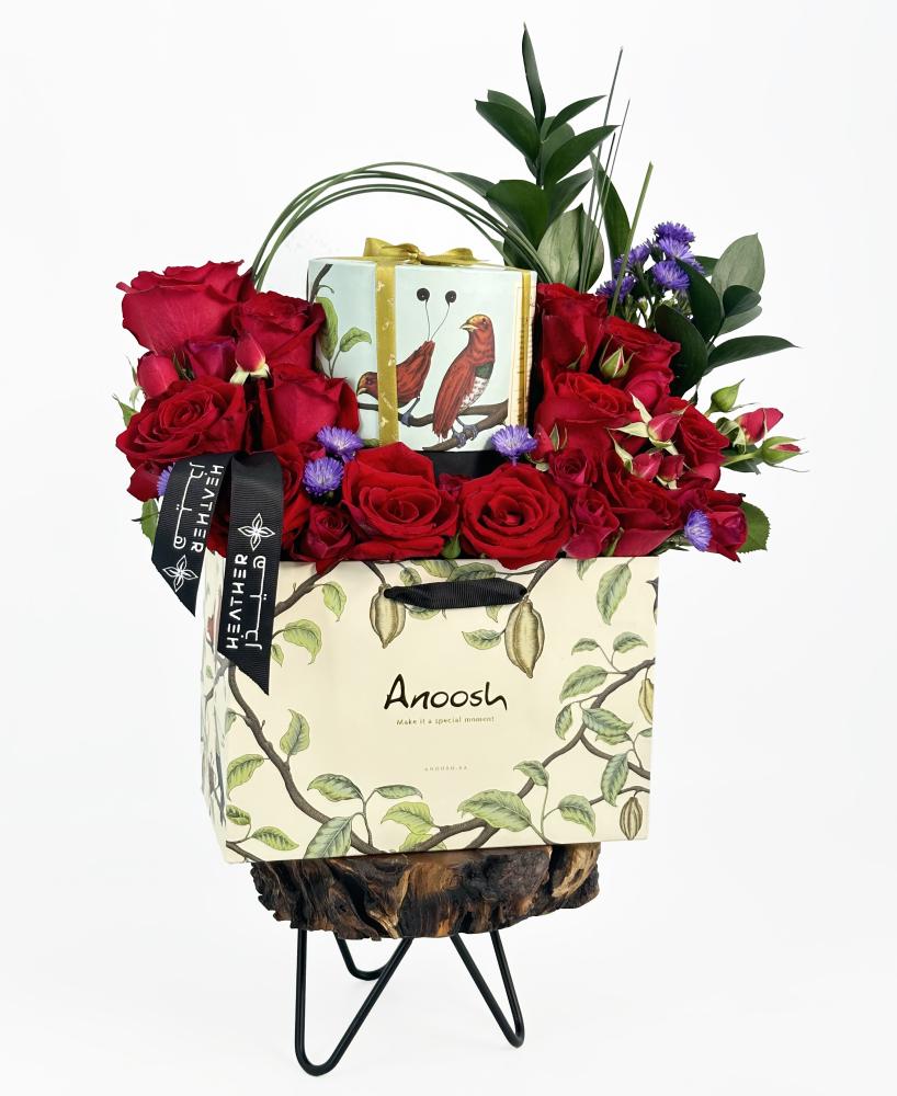 باقة الزهور التي تضم ورد الجوري الأحمر، أسطر موف، روز كوسو، ورد البيبي جوري، وأوراق استيل قراس هي خيارك المثالي إذا كنت ترغب في تقديم هدية تجمع بين الجمال والذوق الرفيع. إضافة إلى ذلك، تجعل شوكولاتة أنوش هذه الهدية أكثر اكتمالًا. إنها الهدية المثالية التي تجمع بين الطبيعة والذوق الرفيع في تنسيق رائع.