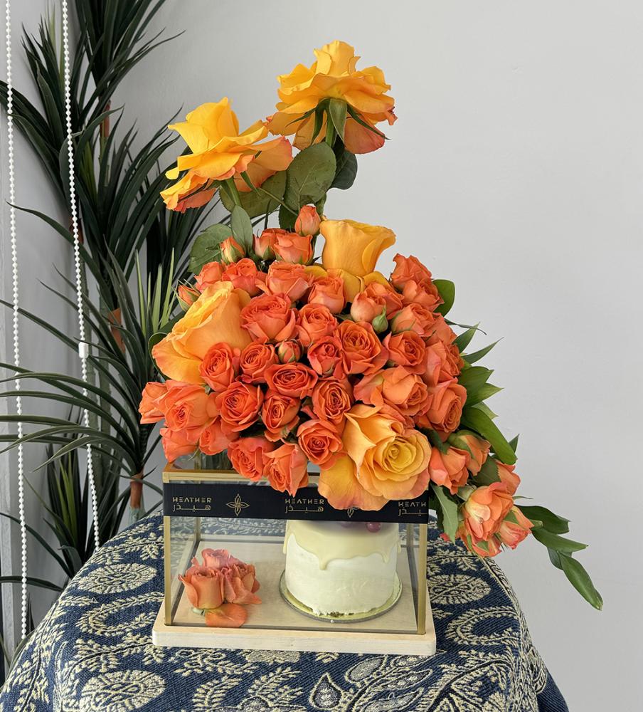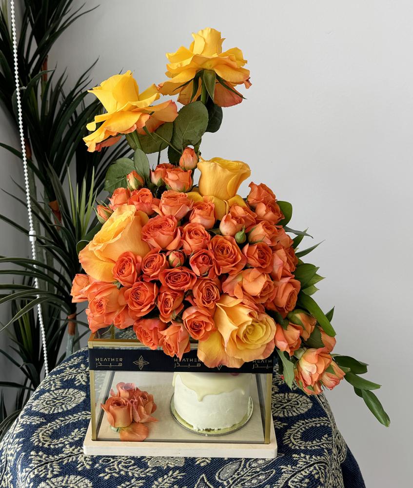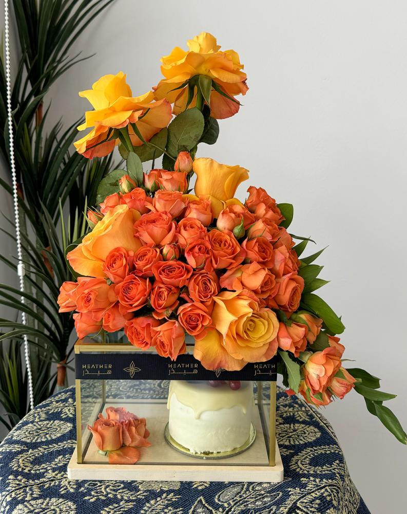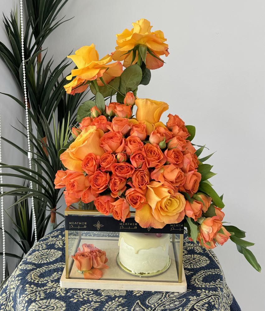 تأمل البوكس للحظة: الكيكة في القاع وكأنها كنز مخبأ، والورد في الأعلى كالتاج. تدرجات الأورنج تعكس الدفء والحيوية، والورد الجوري والبيبي جوري وروز كوس معًا يكوّنون مشهدًا لا يُنسى.