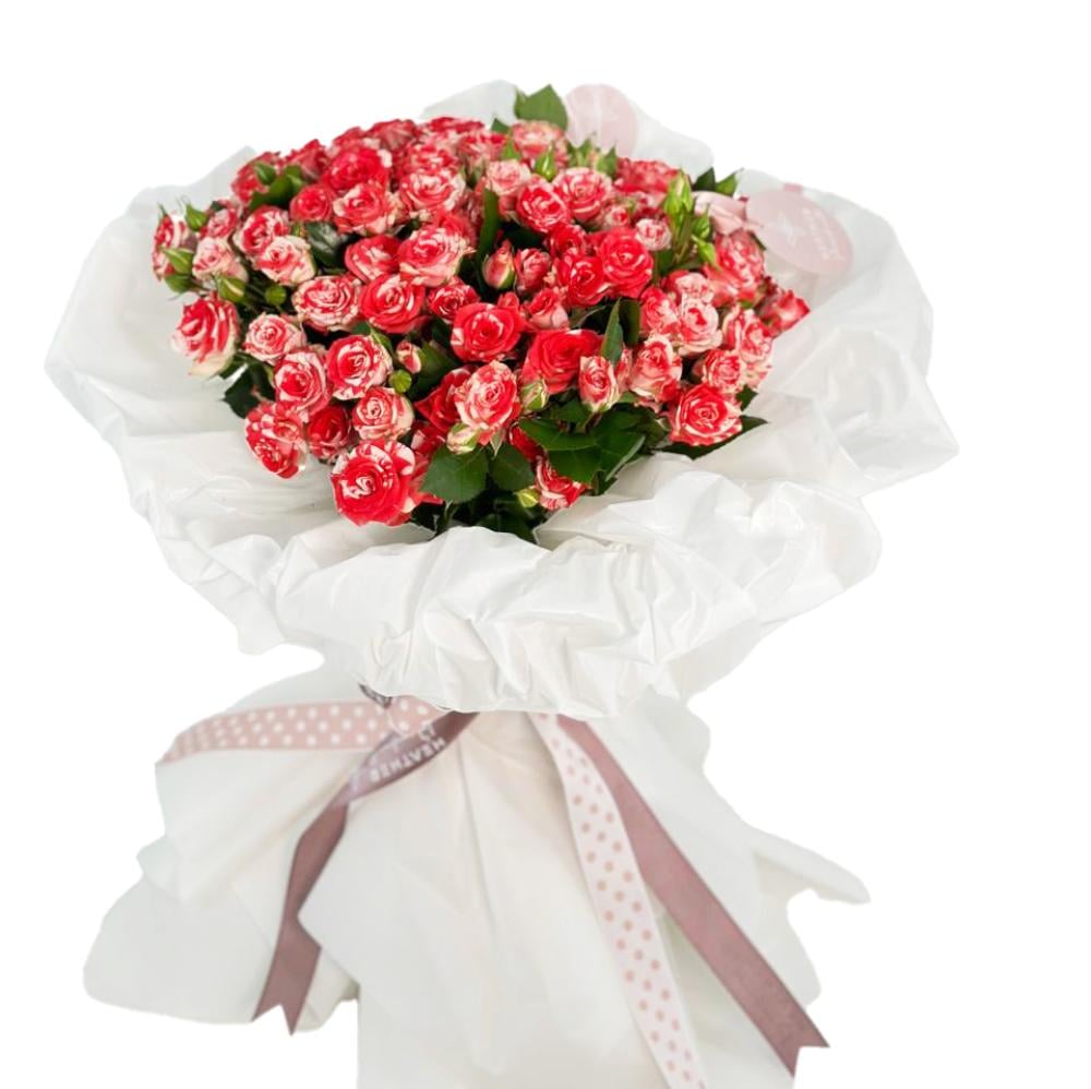 تصميم باقة "روزيندا فلوتيرا" يتميز بالرقة والتناسق. تتناغم الزهور بشكل جميل ومتوازن، مما يعطي الباقة شكلًا هادئًا وجميلًا. يمكن استخدام أوراق خضراء طبيعية أو حبال ساتان لإضافة تفاصيل إضافية وإبراز جمال الزهور.