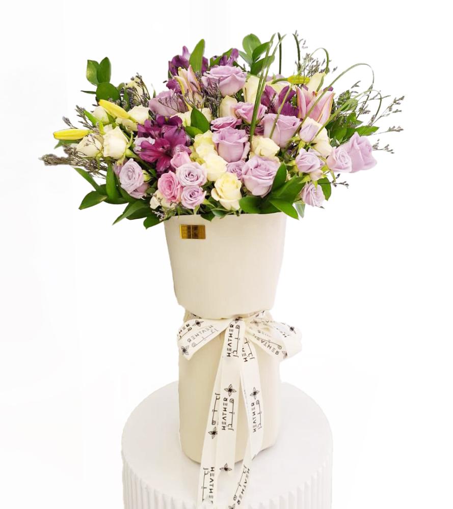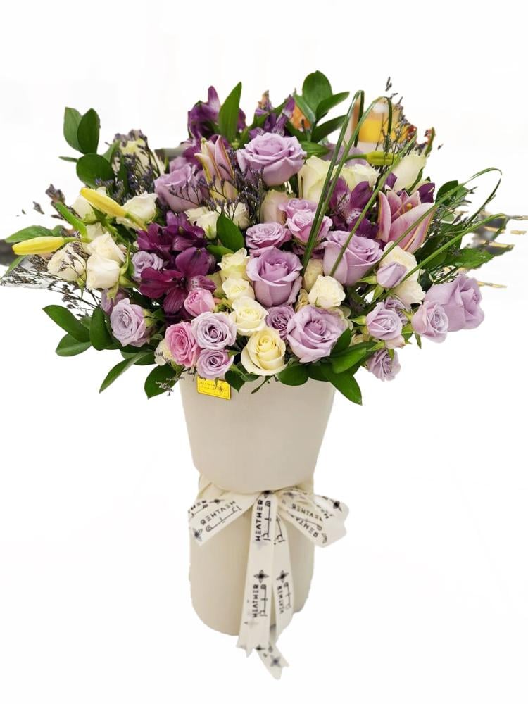 باقة فولكانو بيربل هي باقة ساحرة وفريدة من نوعها تتألف من مجموعة من الأزهار الجميلة والأنيقة. تمتاز هذه الباقة بتناغم الألوان البنفسجية والبيضاء والموف، مما يخلق تأثيرًا ساحرًا ومذهلاً.