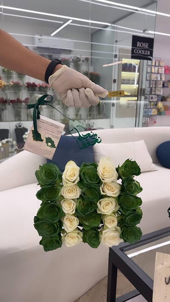 تتكون التوزيعات من 15 حبة من ورد الجوري الأخضر، التي تضفي لمسة من الحيوية والانتعاش، وترمز إلى النمو والتجدد. كما يتضمن الأستاند أيضًا 10 حبات من ورد الجوري الأبيض، التي تعكس النقاء والجمال، مما يخلق توازنًا رائعًا بين الألوان.