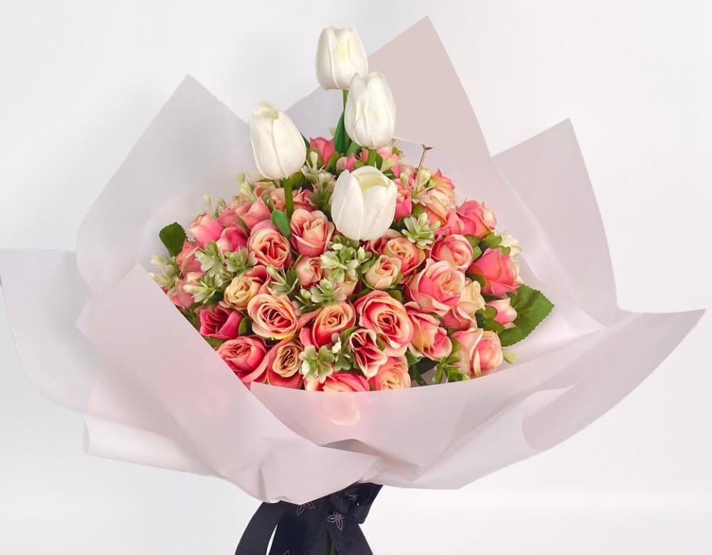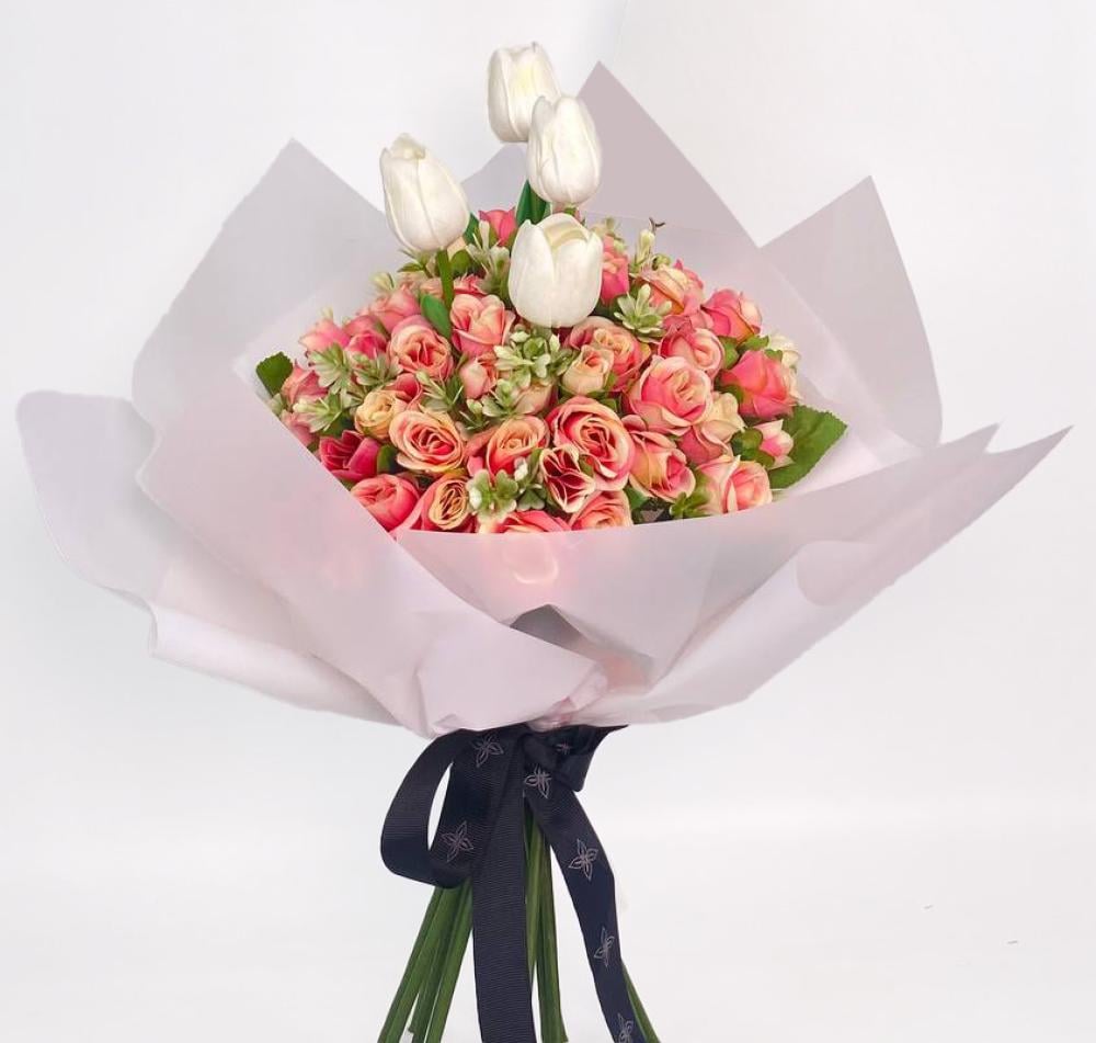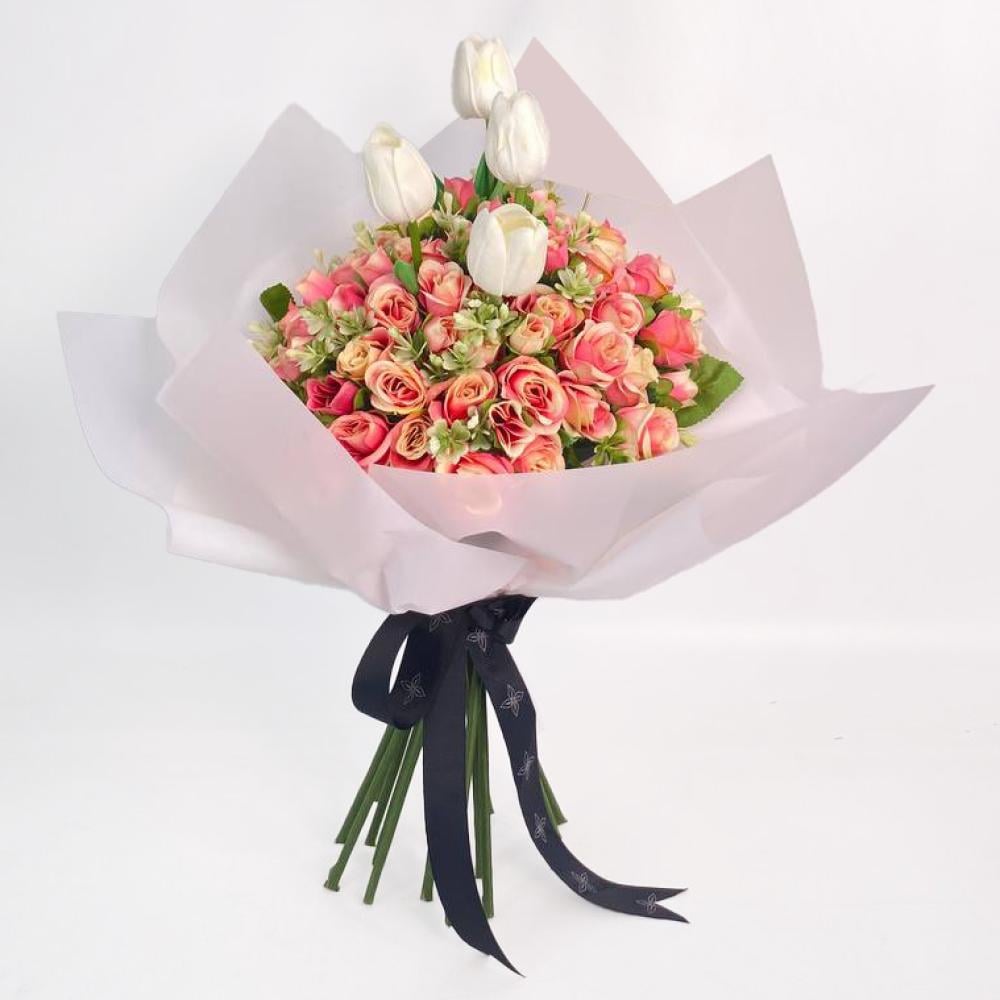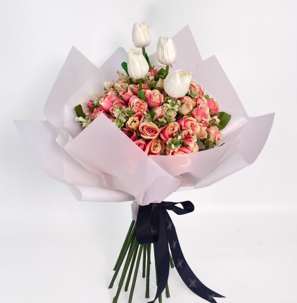 الورود مرتبة بعناية في تكوين دائري متناسق. هذا التصميم المحكم يجعل الباقة متماسكة ومتوازنة بشكل جمالي.