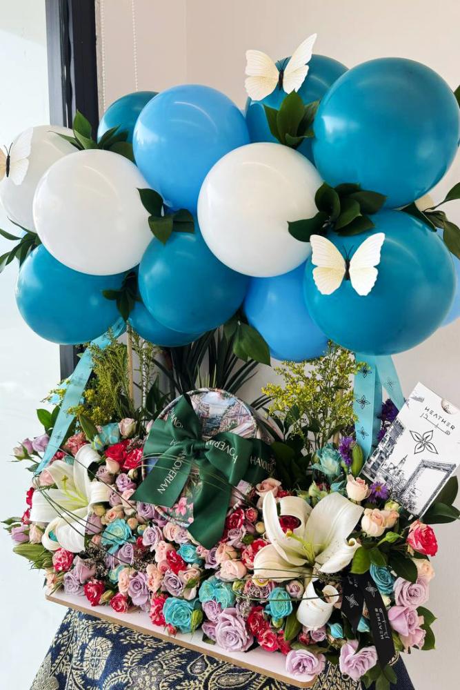 ليس هذا فقط، فوسط هذا الجمال الطبيعي تحتضن الباقة قطعة فاخرة من شوكولاتة هنوفيرين مكس براند، بعلبتها الراقية، لتجمع بين الذوق الرفيع والذوق الحسي في لحظة واحدة. تكتمل التفاصيل ببالونات ملونة بالأزرق والأبيض، تضيف لمسة من البهجة والفرح، وتُعرض جميعها على أستاند أبيض خشبي متين، يمنح الترتيب مظهراً أنيقاً يصلح لأي مناسبة فاخرة أو لحظة استثنائية.
