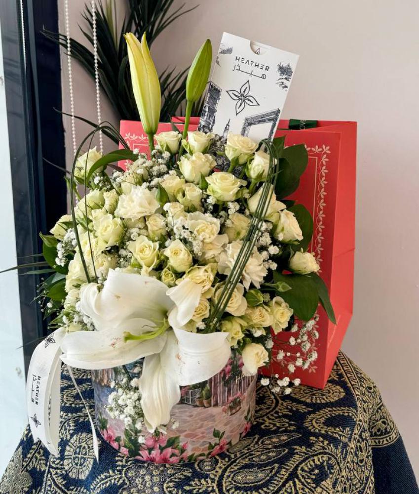 في لحظات نبحث فيها عن هدية تعبر بصدق، تتحدث التفاصيل بدلاً من الكلمات. تنسيق باقة هيذر البيضاء يقدّم مزيجاً راقياً من الورد الطبيعي الأبيض المتناسق مع علبة شوكولاتة هنوفيرين مكس براند الفاخرة، ليجعل من اللحظة ذكرى لا تُنسى.