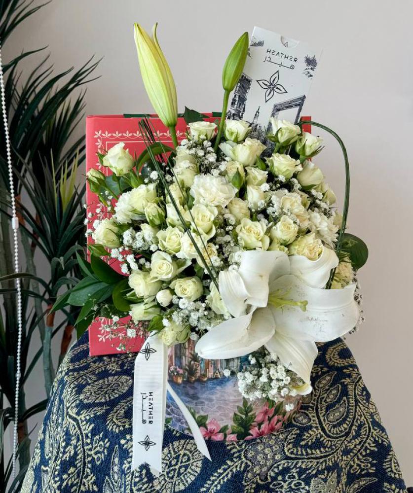 تحتضن الباقة مزيجاً أنيقاً من ورد البيبي جوري الأبيض، أزهار الكازبلانكا البيضاء، روز كوس، قرنفل أبيض، واستيل قراس، صُممت بانسيابية تجمع بين البساطة والفخامة، وتُقدَّم بأسلوب تنسيقي هادئ، يعكس الذوق النقي والاهتمام بأدق التفاصيل.
