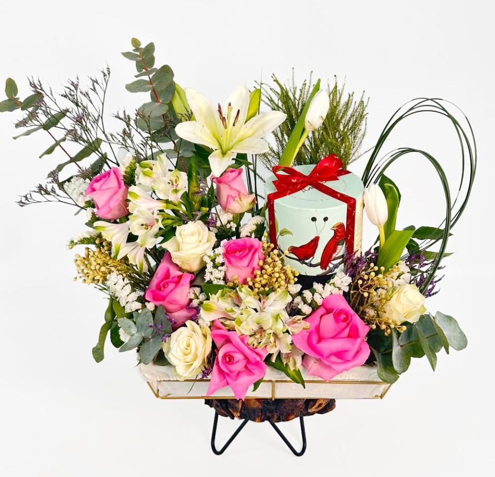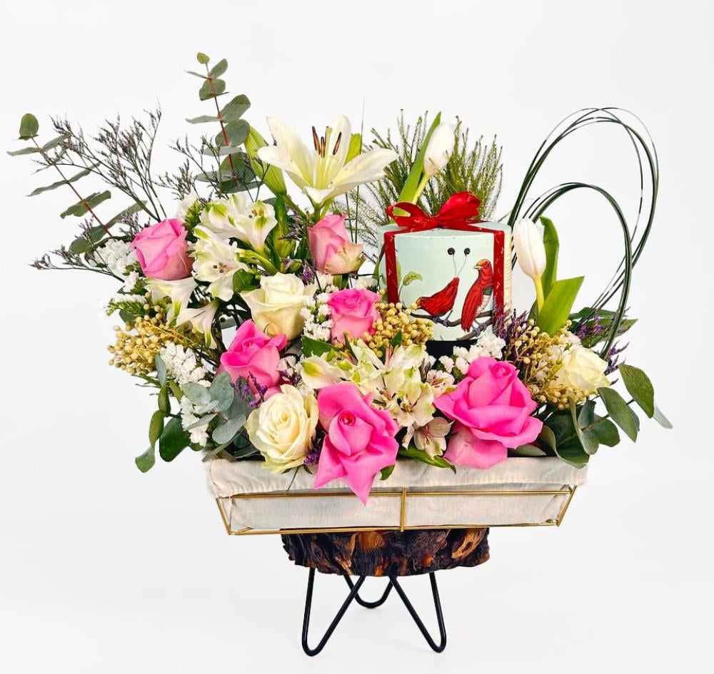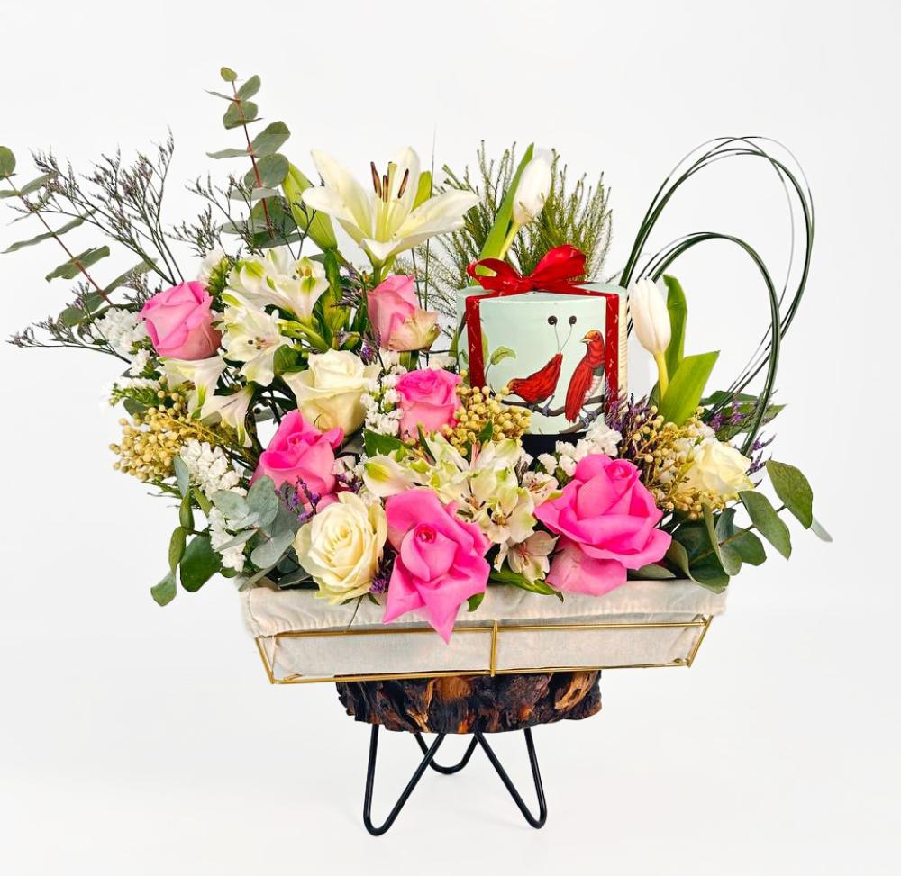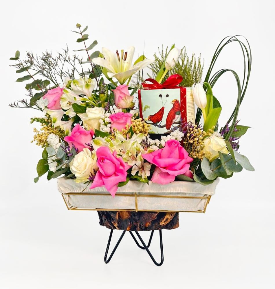 وفي وسط هذه التحفة، تحتضن السلة شوكولاتة أنوش ربع كيلو، التي تضيف لمسة من الحلاوة والرفاهية، مما يجعل هذا التنسيق مثاليًا كهدية تعبر عن المشاعر الجياشة. بفضل تصميمها الجذاب وتركيبتها المتنوعة، تُعتبر هذه السلة إضافة مثالية لأي احتفال، مما يُضفي لمسة من الأناقة والتميز على كل مناسبة.