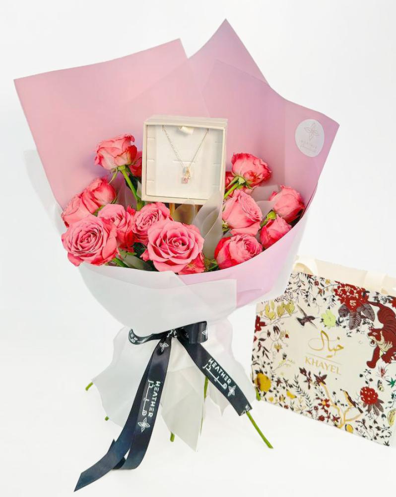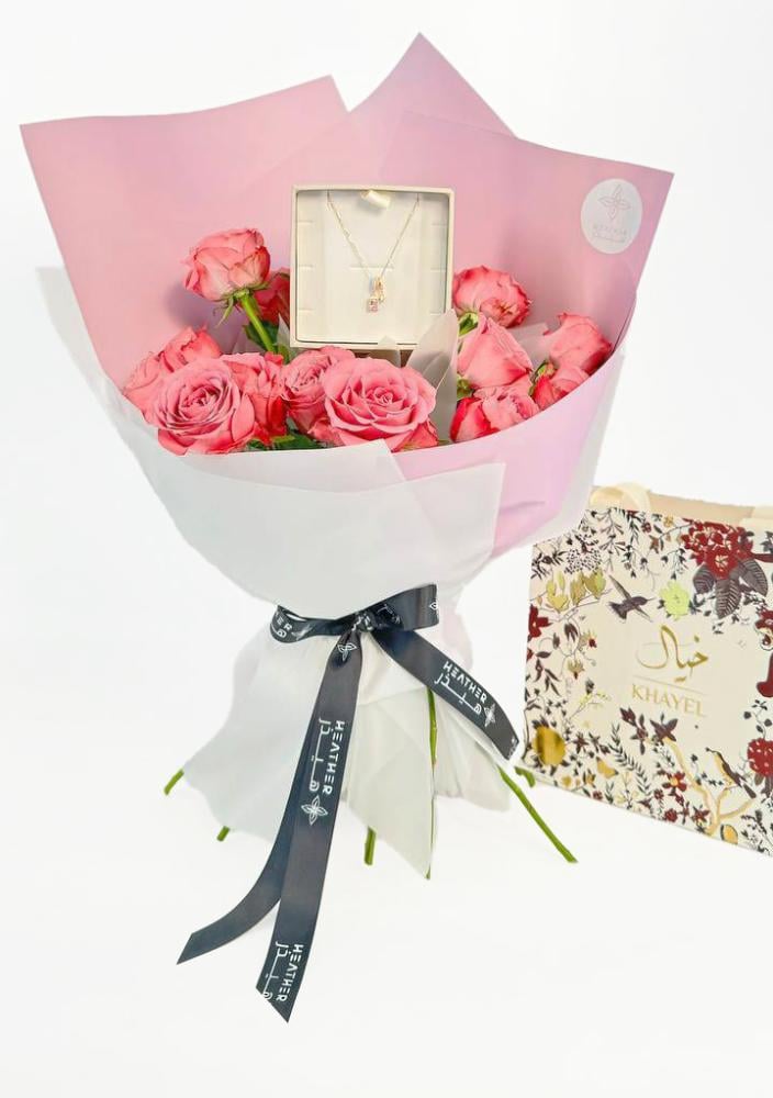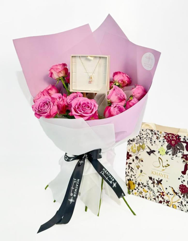 هذا التنسيق الأنيق من إكسسوارات باقة الورد الجوري الموف يعكس جمال الطبيعة بأسلوب راقٍ ومتميز: