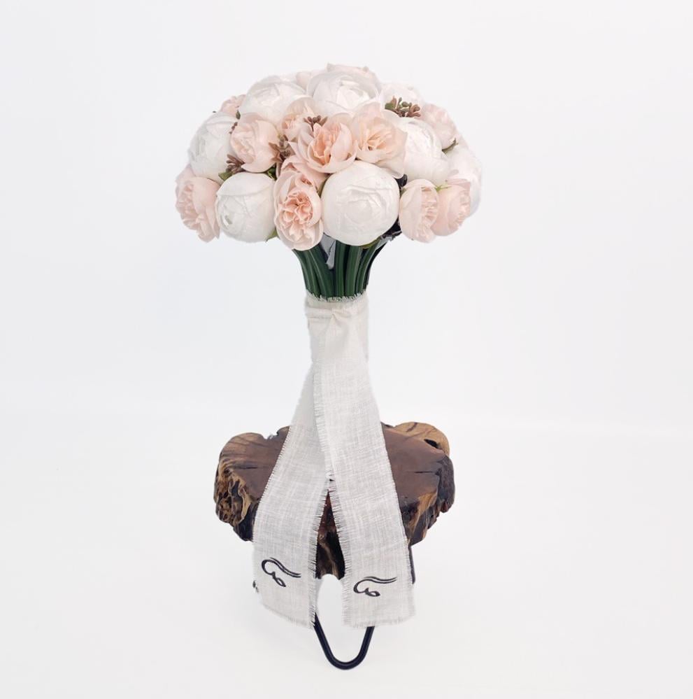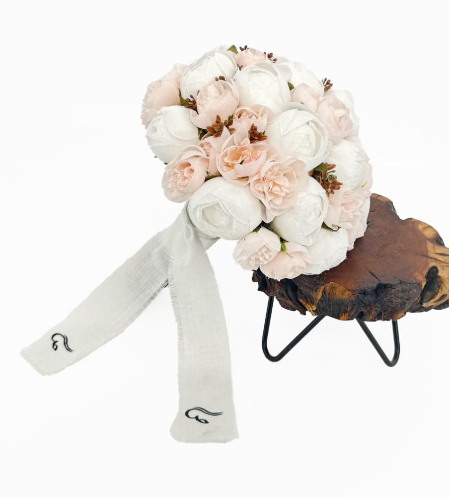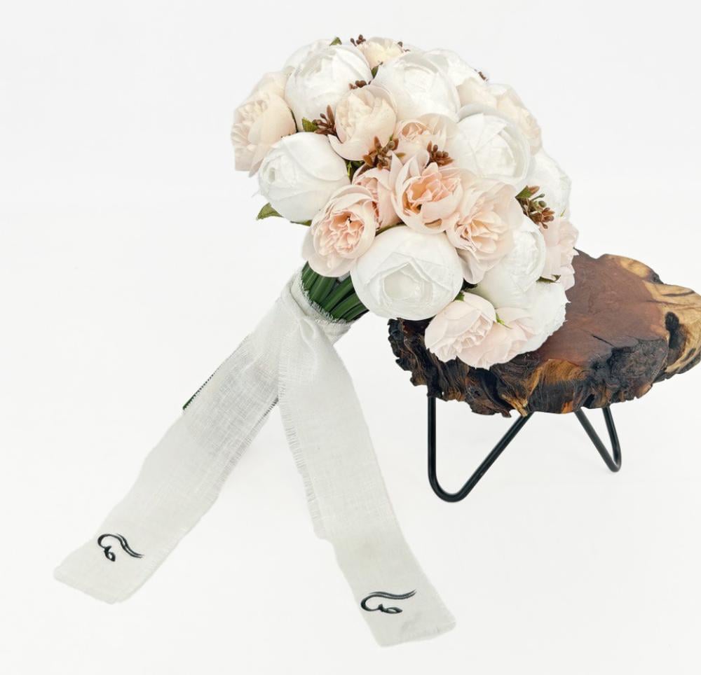 تشكل مسكة الورد الصناعي المتألقة للعروس إضافة جمالية رائعة لإطلالتها في يوم زفافها. تتميز هذه المسكة بتصميم فريد، حيث تم إحاطة الورود الاصطناعية الناعمة والبيضاء والوردية بشريط قماش أنيق ومطبوع عليه الأحرف الأولى من اسم العروس.