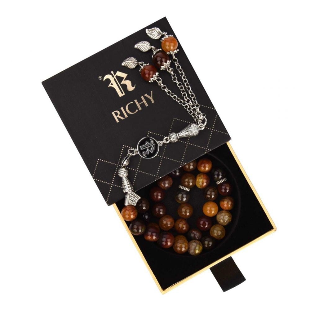 سبحة ريتشي الفاخرة مصنوعة يدويا من العقيق العسلي تحت امهر خبراء السبح ، ذات ملمس ناعم وبراق وتم تصميمها بنقاشات محفورة بارزة مزينة بشعار ريتشي ، تقدم فى عبوة أنيقة تحمل شعار ريتشي