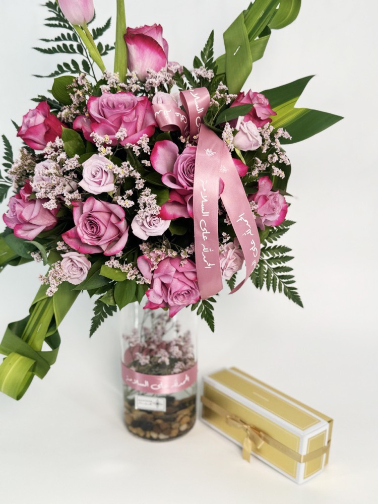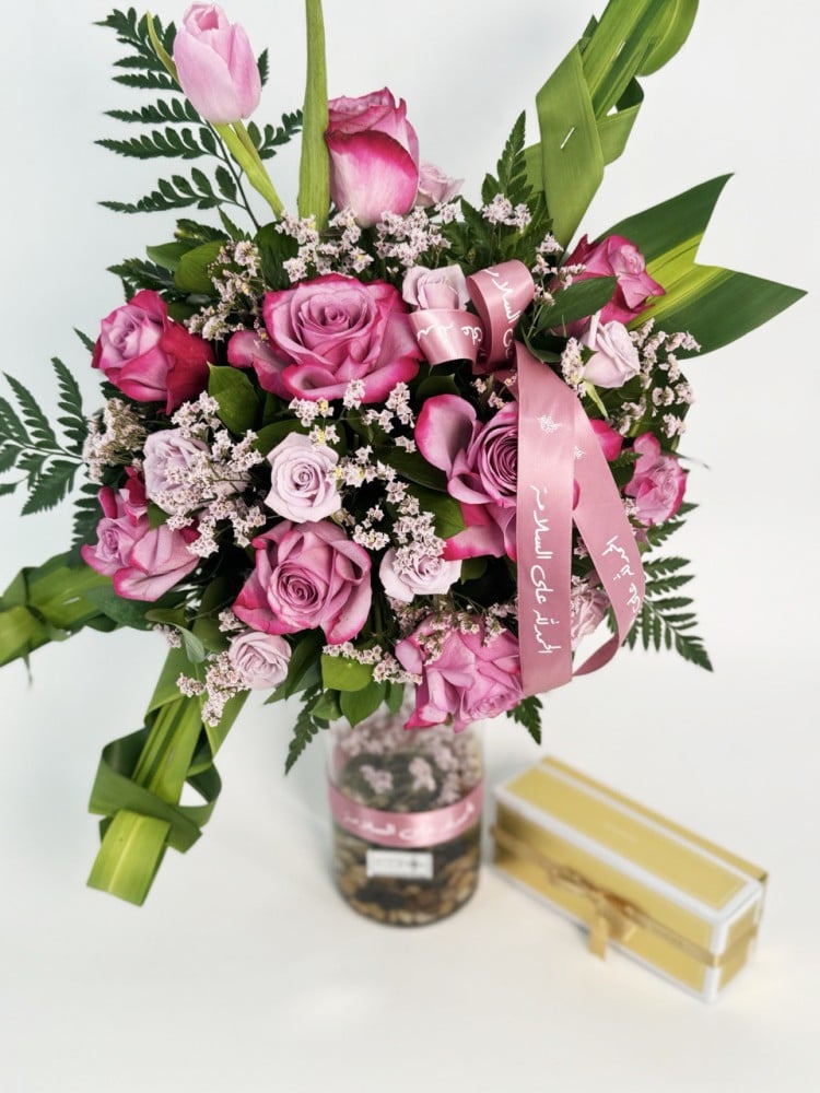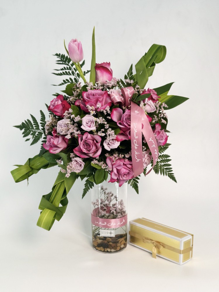 فازة ساحرة تجمع بين مجموعة رائعة من الزهور الفريدة والجميلة. تتكون هذه الفازة من زهور جوري موف وبيبي جوري موف وتوليب زهري وليمونيوم ودارسينا ولذر ليب.