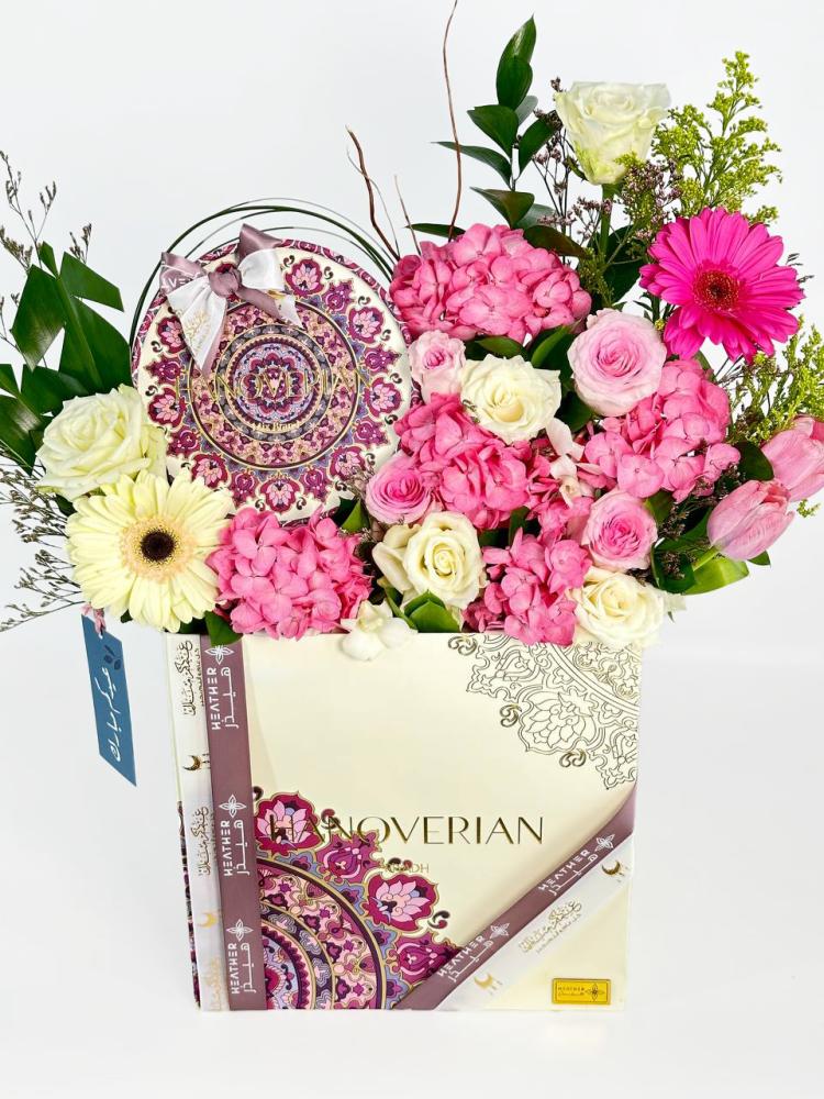 تتكون من مجموعة متنوعة من الزهور والشوكولاتة، وهو يتميز بالألوان الجميلة والتناغم البصري. إليك وصفًا لتلك الهدية: