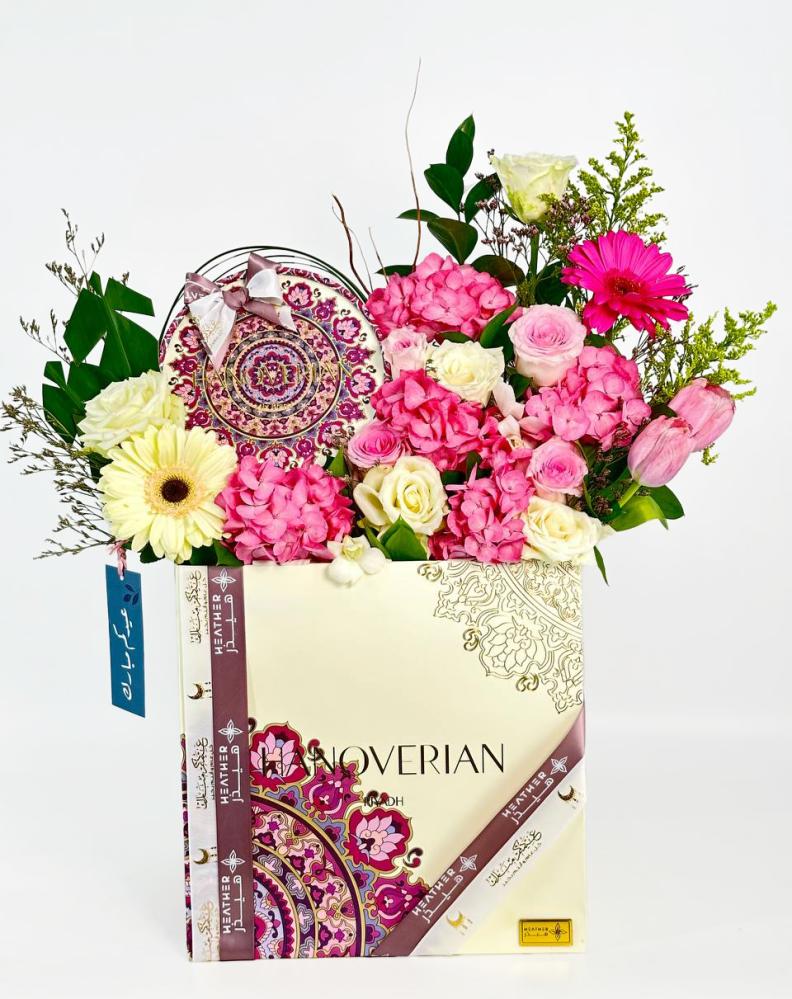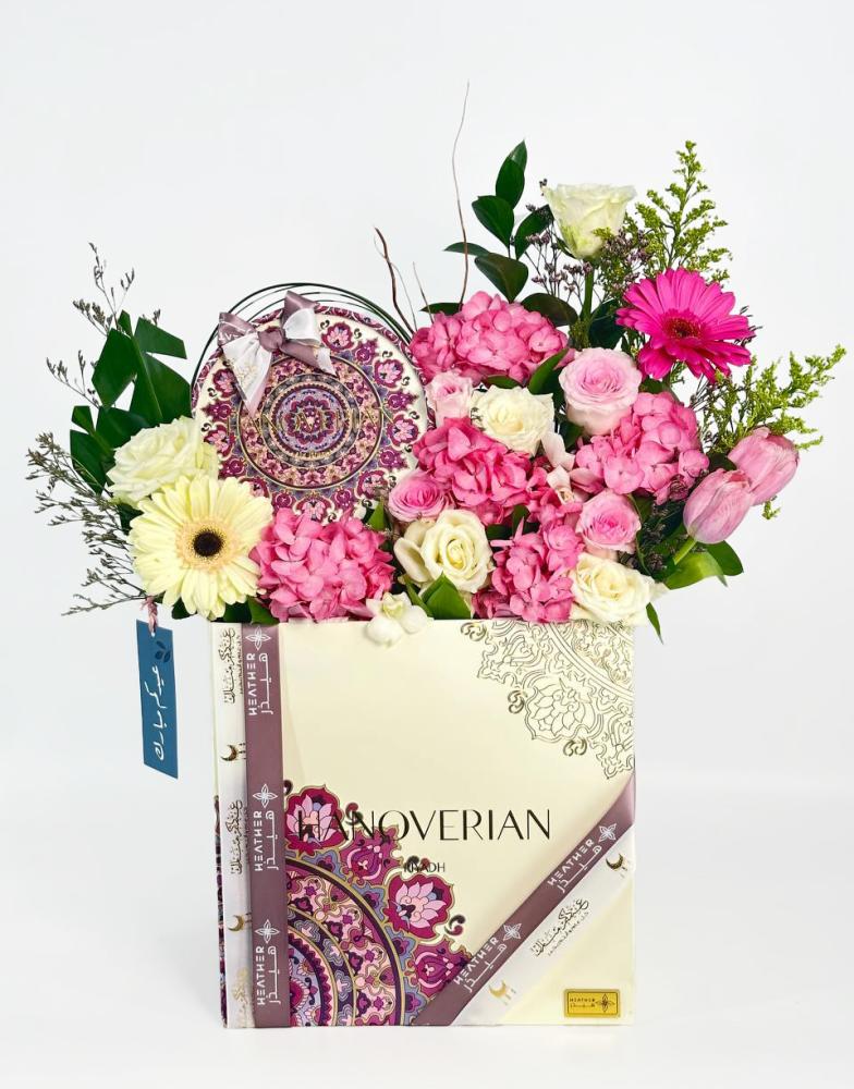تتألف الهدية من باقة من الزهور الجميلة والمتنوعة. تشمل الزهور البيضاء من جوري، الوردي من جوري وتوليب وجلبيرا، والفوشيا من جلبيرا. تضيف زهور هيدرينجا الوردية وليمونيوم البنفسجي لمسة من الألوان الزاهية والحيوية.