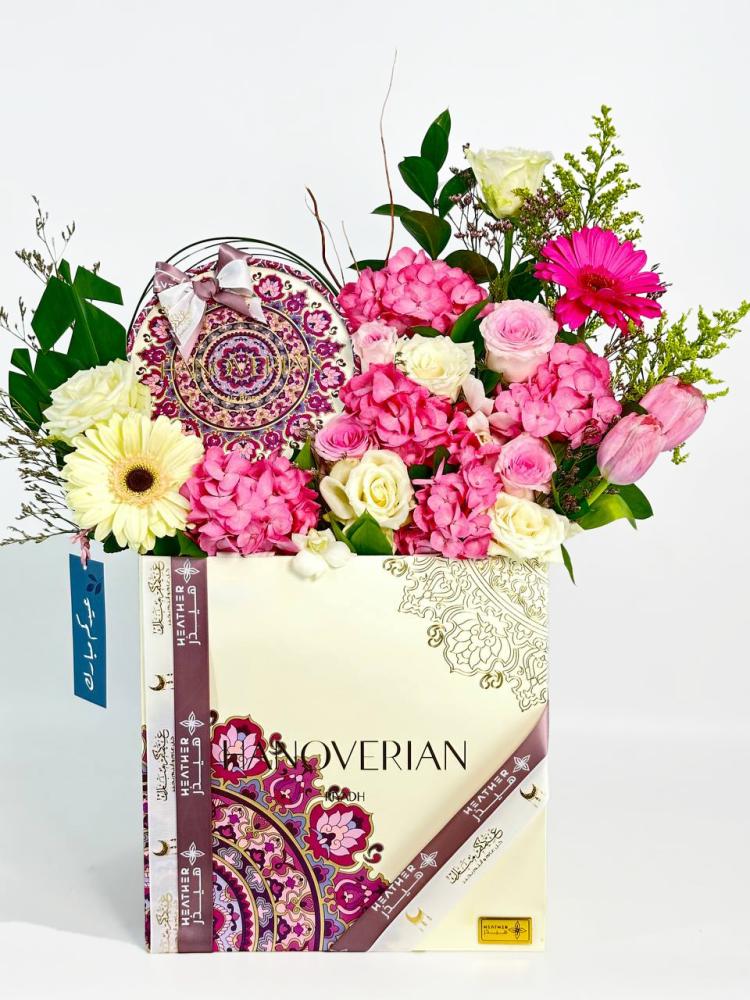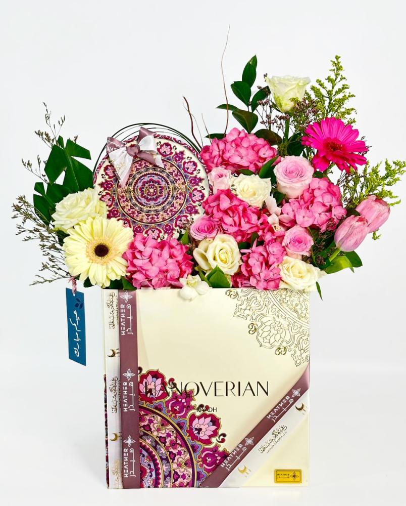 باختصار، هذا التنسيق يجمع بين جمال الزهور المتنوعة والشوكولاتة اللذيذة، ويعبّر عن التهنئة والفرح بمناسبة عيد الفطر.