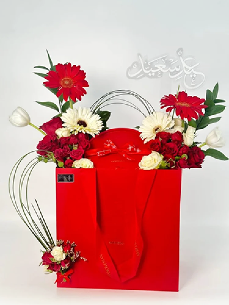 لكن هذه المجموعة الرائعة لا تكتفي بالزهور فقط، بل تحتضن أيضًا عبارة "عيد سعيد" المصنوعة من الأكريليك، مما يعزز التهنئة ويجعلها تدوم لفترة طويلة كتذكار رائع. ولإضفاء لمسة حلوة ومميزة، تأتي المجموعة مع علبة شوكولاته هنوفيرين الراقية.