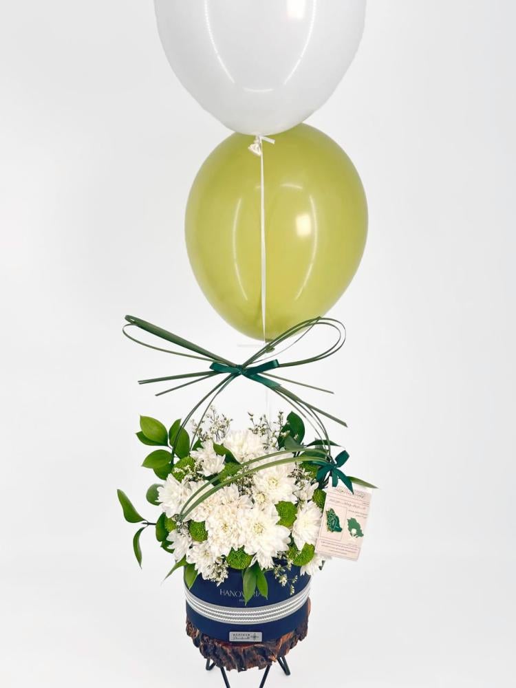 محيطة بهذه العلبة الرائعة، تتألق باقة من الكريز الأبيض، الذي يضفي لمسة من النقاء، إلى جانب أوراق الروز كوس الخضراء التي تضيف حيوية وانتعاشًا.