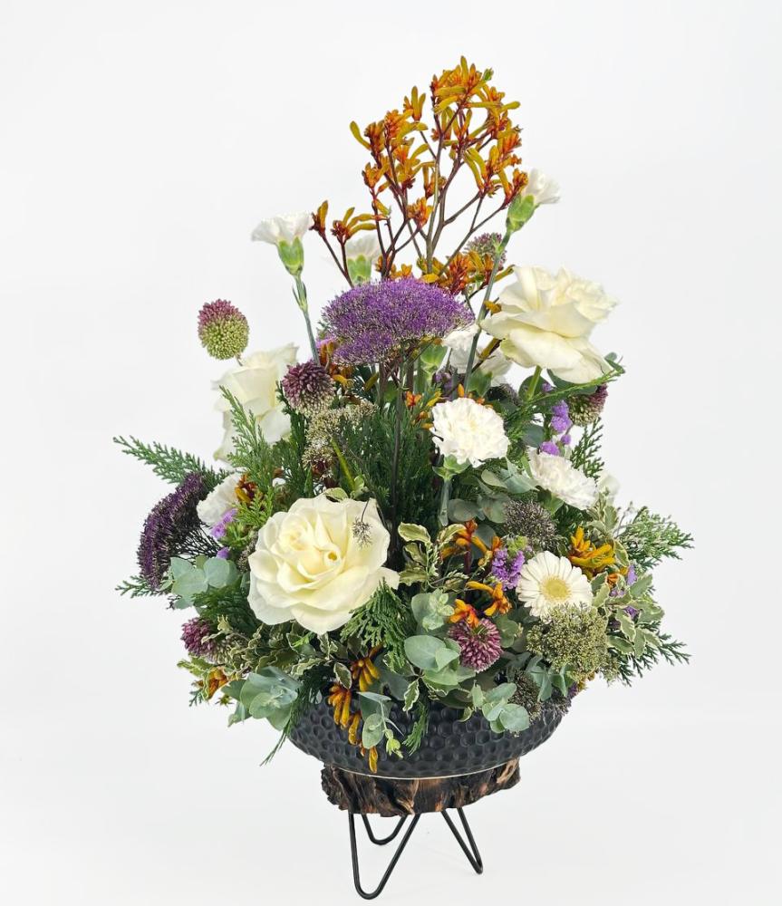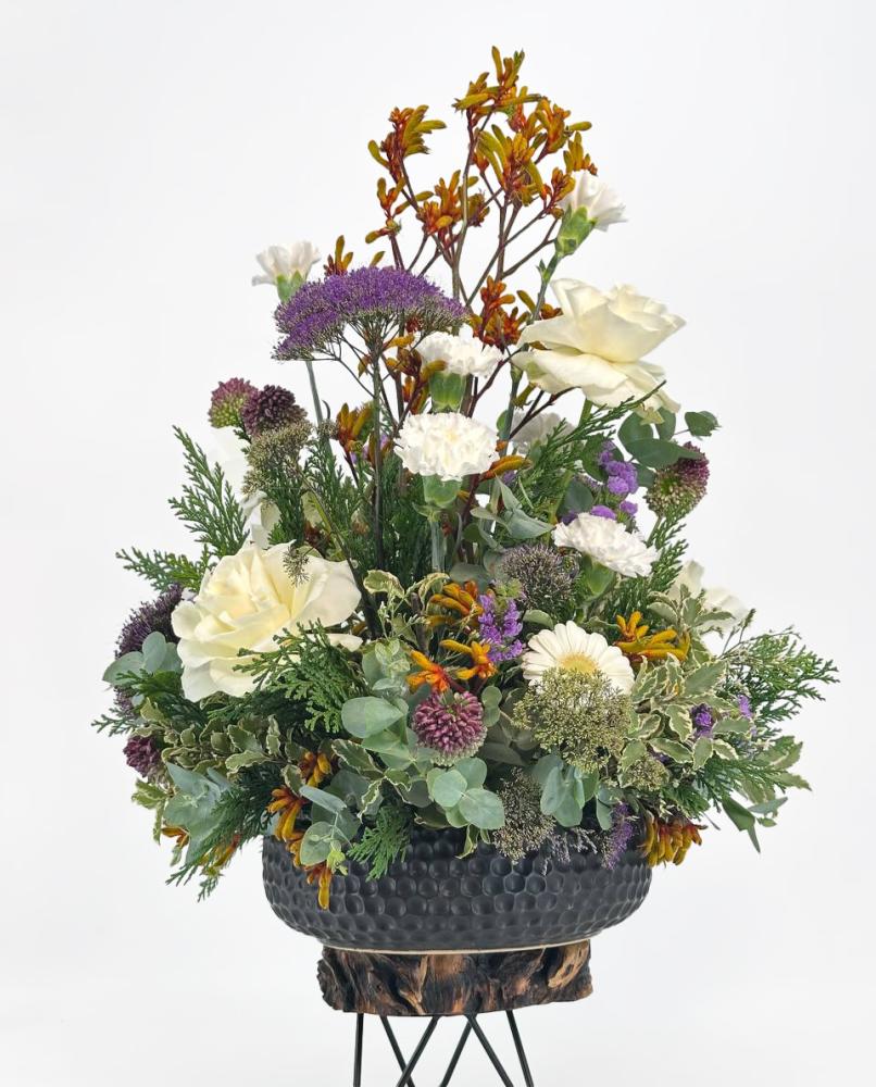 تُعتبر فازة السيراميك الأسود الدائري بمظهرها الأنيق وتنسيقها المميز من الأزهار الطبيعية خيارًا فاخرًا يبرز جمال أي مساحة. تتميز هذه الفازة بتنوع أزهارها، مثل الكريسي الأخضر والأبيض، الكرونفل الأبيض، والقراسيكا الموّف، مما يضفي لمسة من الحيوية والجاذبية.