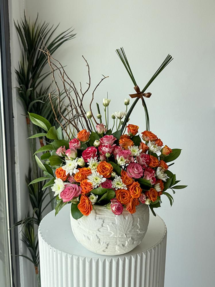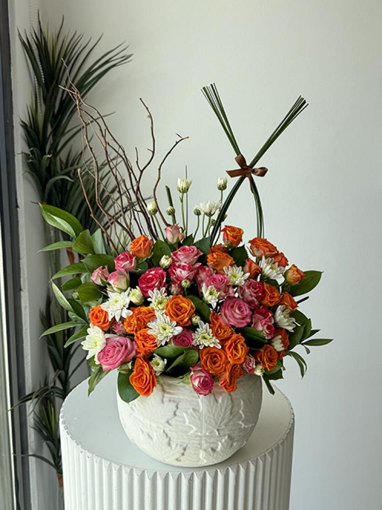 مزيج فريد من ألوان الورود المتنوعة يضفي حياة وحيوية على التنسيق، مع توازن مثالي بين ألوان دافئة وباردة تضفي تباينًا مميزًا.