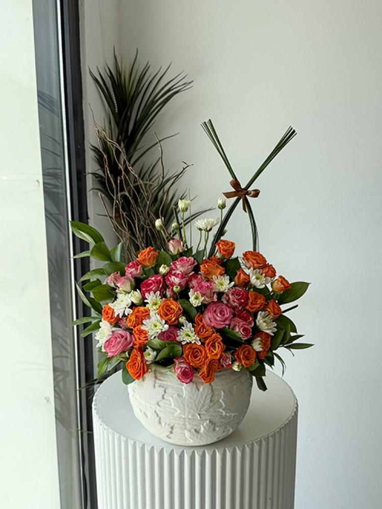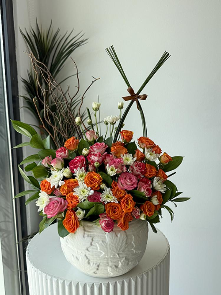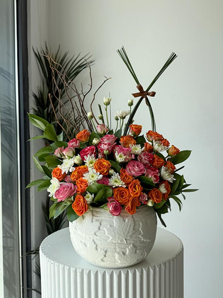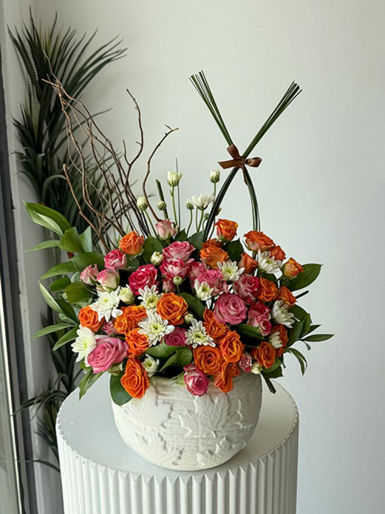 تتجلى الفخامة والرقي في تفاصيل فازة رخام دائرية بلون أبيض ناصع، تحمل بين أحضانها باقة استثنائية من أجمل وأندر أنواع الورود الطبيعية التي تجمع بين ورد البيبي جوري الزهري الدافئ، وورد البيبي جوري الأورنج النابض بالحياة، وورد بيبي كريز الأبيض النقي. يتوسط هذه التوليفة الرائعة الروز كوس المعروف بفخامته وتميزه، مع لمسات خضراء من أوراق الاستل قراس التي تضفي عمقًا وطابعًا طبيعيًا متناغمًا.