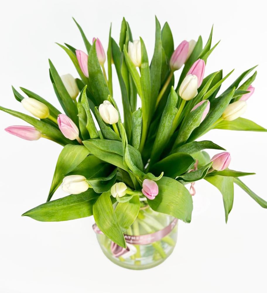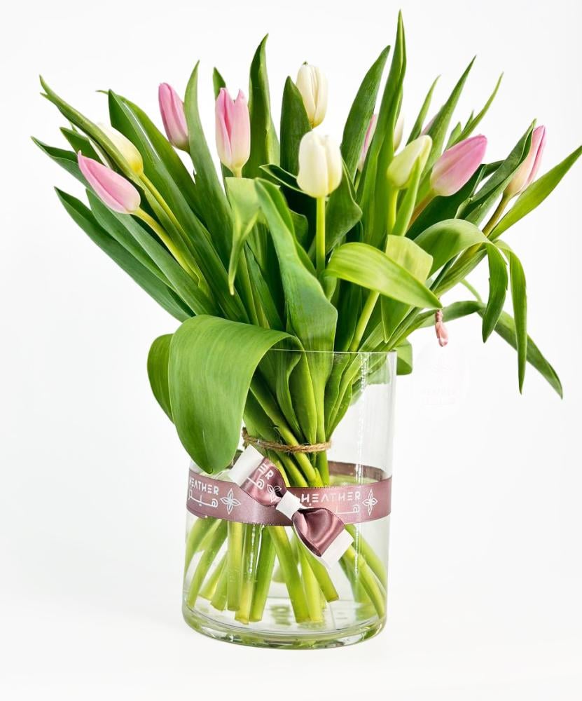 فازة زجاجية مذهلة تتألف من مزيج ساحر من زهور التوليب الأبيض والزهري. تتميز زهور التوليب بأزهارها الكبيرة والأنيقة ذات الألوان الزاهية والمشرقة. تتراوح ألوان الزهور من الأبيض النقي إلى الزهري الناعم، مما يضفي على الفازة لمسة من الجمال الأنثوي والرقة.