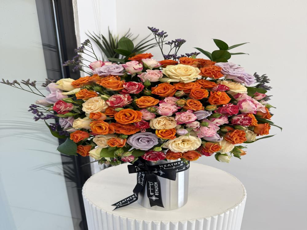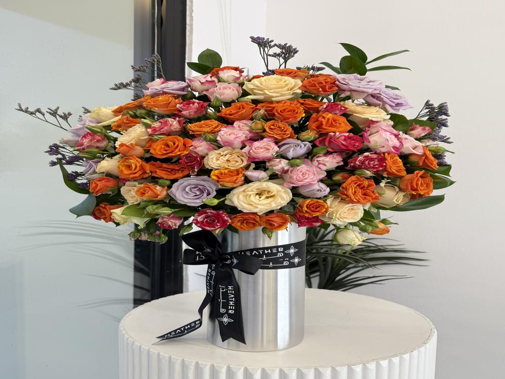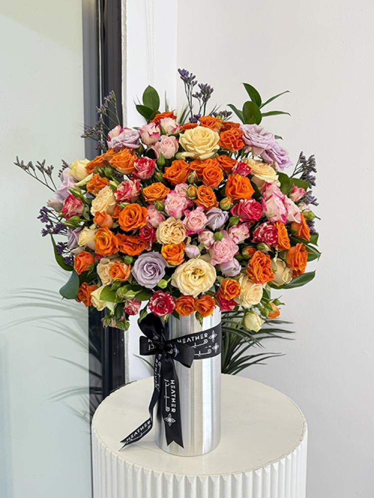 هل تبحث عن قطعة فنية تنطق بالجمال وتضفي لمسة ساحرة على مساحتك؟ 🤍 هنا في هيذر، نقدم لك تحفة فنية استثنائية: فازة اتسيل فضي المزينة بتوليفة مبهرة من زهور البيبي جوري بألوان أورنج، موف، زهري وسكري، مع لمسات رائعة من الليمونيوم وروز كوس الفاخر.