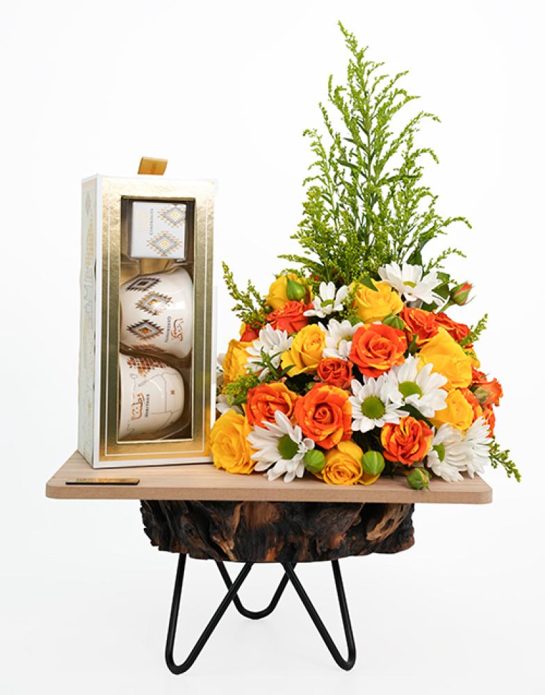 فنجالين كرمنا الأنيق، مع شوكولاتة بستاني الفاخرة، يُقدمان لكِ مزيجاً رائعاً من الذوق الرفيع. بجانبها باقة ساحرة تضم: