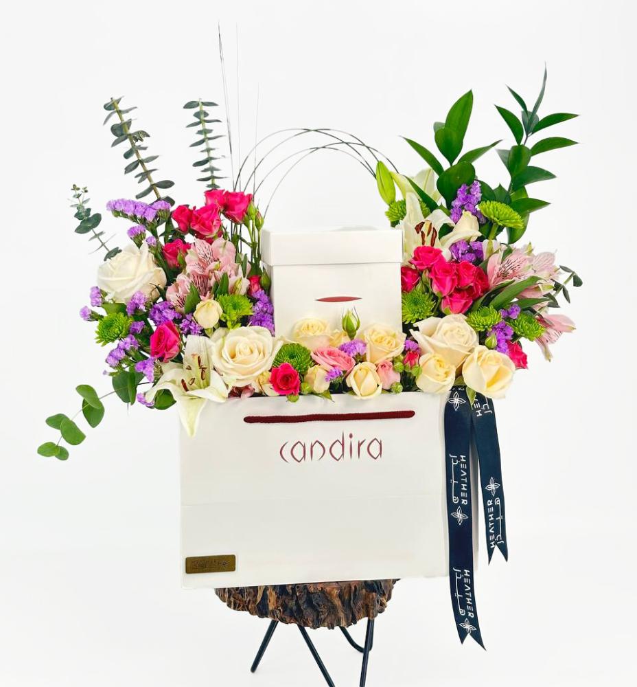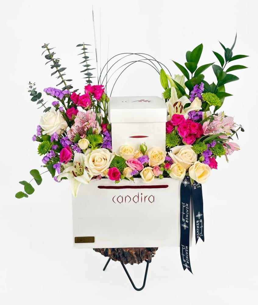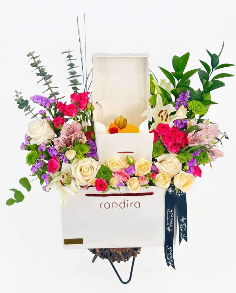 اجعل لحظاتك أكثر سحراً وأناقة مع هذا التنسيق الفاخر من الورد الطبيعي الذي يحتضن علبة كيكة كانديرا الشهية. يتميز التنسيق بمزيج متناغم من الألوان الطبيعية والزهرية ليمنحك هدية لا تُنسى.